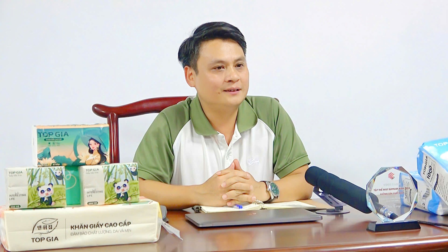 Trưởng phòng Pháp chế của Công ty, ông Nguyễn Anh Phương nhấn mạnh: Trong chiến lược phát triển năm 2025, Top Gia đặt mục tiêu xây dựng nhà máy sản xuất phôi giấy tại khu vực phía Bắc, hướng đến nội địa hóa hoàn toàn nguyên liệu đầu vào.