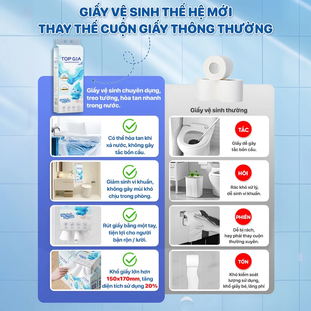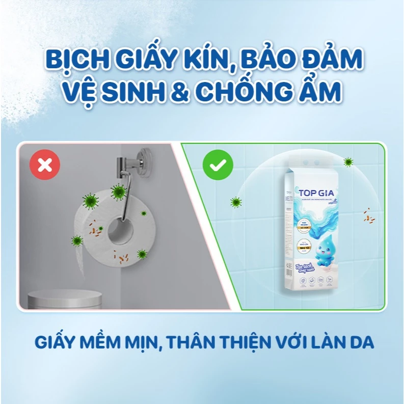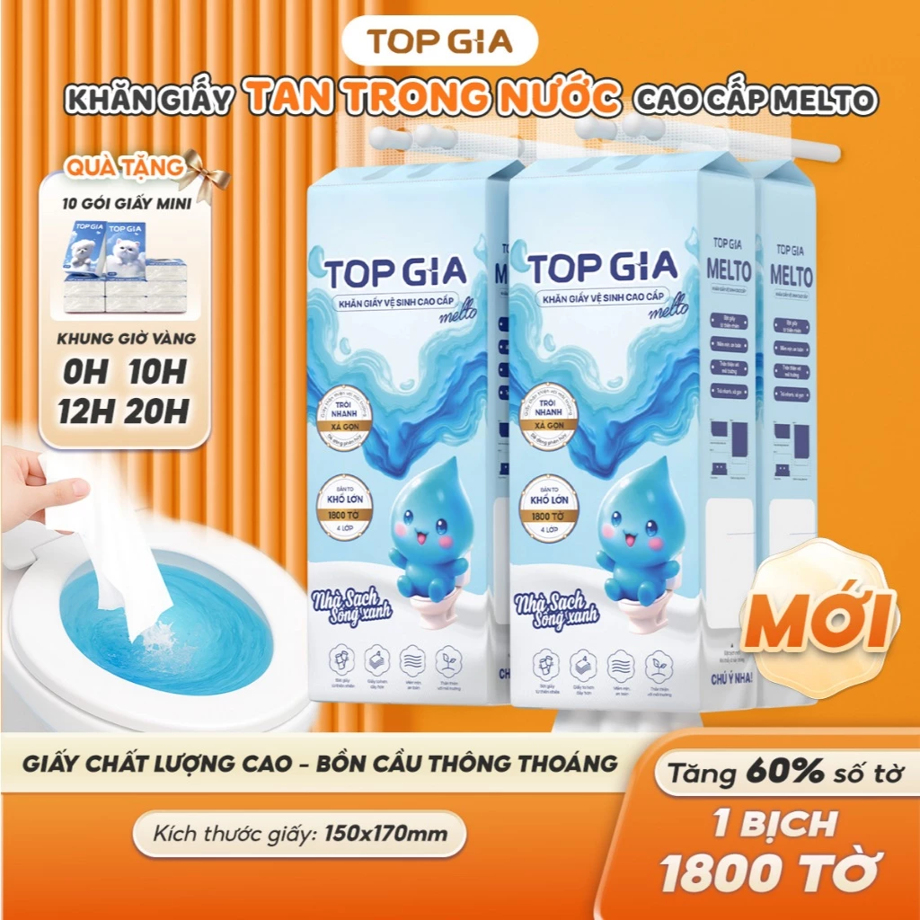 Giấy vệ sinh là vật dụng không thể thiếu trong mỗi gia đình. Với MELTO - dòng khăn giấy tan trong nước cao cấp của TopGia, bạn hoàn toàn yên tâm sử dụng mà không lo tắc bồn cầu hay ảnh hưởng đến môi trường. Giấy mềm mịn, dai, tan nhanh trong nước - an toàn cho da và hệ thống thoát nước.