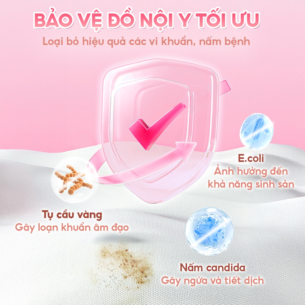 - Công thức kháng khuẩn vượt trội – Loại bỏ vi khuẩn, nấm mốc, bảo vệ sức khỏe vùng da nhạy cảm. Làm sạch tất cả từ vết đỏ của mùa dâu rụng, dịch hàng ngày, dịch bà bầu, cho con bú… đều được làm sạch nhẹ nhàng chỉ sau vài phút