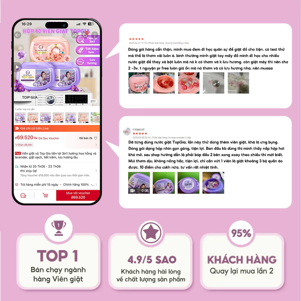 - Tẩy vết bẩn hiệu quả: Viên giặt TOP GIA loại bỏ vết bẩn một cách hiệu quả, và diệt khuẩn tới 99%, giúp quần áo luôn sạch sẽ và mới mẻ.